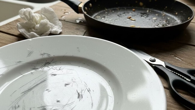Entre el roce constante del tenedor y el cuchillo, los platos terminan llenándose de esas rayitas grises que los hacen ver viejos, aunque no lo estén. Lo mismo pasa con algunos sartenes, el fregadero e incluso las tijeras de cocina. Y sí, aunque laves y talles, muchas veces esas marcas simplemente no desaparecen.