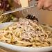 Los chefs italianos no mienten: el agua donde hirvió la pasta es clave. Esa agua contiene almidón que ayuda a ligar la crema para batir, evita que la mezcla quede seca y da un brillo delicioso.