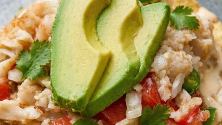 Unta un poco de mayonesa sobre una tostada, agrega el salpicón de pescado y termina con unas rebanadas de aguacate.