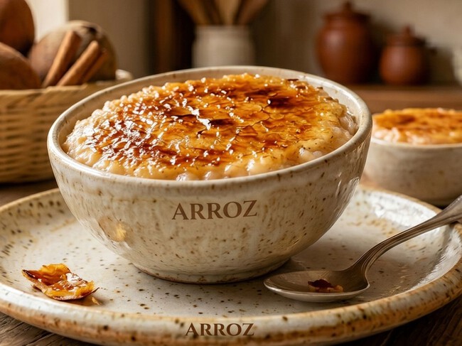 Lo que distingue a esta preparación es la forma en la que se trabaja la textura: aquí el arroz se cocina lentamente hasta quedar ultra cremoso, y al final se corona con una capa de azúcar caramelizada que aporta contraste. Ese equilibrio entre suavidad y crocante es lo que hace toda la diferencia.