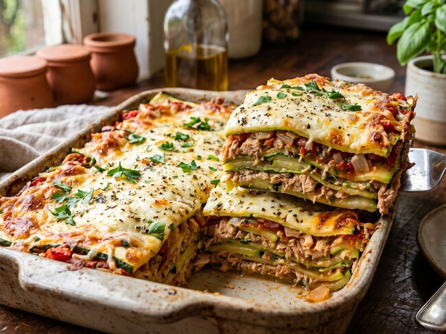 Puedes llamarla pastel de calabacita con atún o milhojas, pero la verdad es que se siente como una lasaña. Solo que más ligera, sin pasta, con menos grasa y mucho más rápida. Ideal si quieres cenar rico sin complicarte.