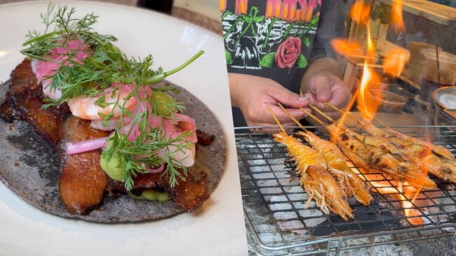 Otra opción que no te debes perder en tu visita es el taco de papa de cerdo con tare y, por supuesto, los camarones Mal Hecho, que están bañados en una salsa elaborada con chile chiltepín con chapulines.
