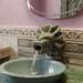 Azulejos en tonos verdes y blancos recubren el espacio, pero el detalle que realmente roba miradas es el lavabo: el agua brota directamente desde la boca de Quetzalcóatl, esculpido como parte de la instalación.