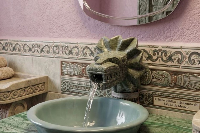 Se trata de unos baños públicos que se han vuelto virales por su peculiar estética prehispánica, donde el protagonista absoluto es Quetzalcóatl.